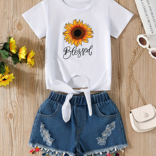 2-Piece Girls' Sunflower and Letter Graphic Print T-Shirt and Denim Shorts Set
