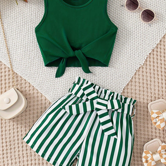 Girls 2-Piece Sleeveless Top and Striped Shorts Set with Bow Belt