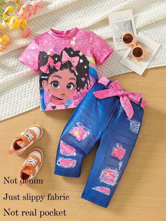 2pcs Trendy Cartoon Girl & Glitter Pattern Set - T-shirt & Imitation Denim Pants